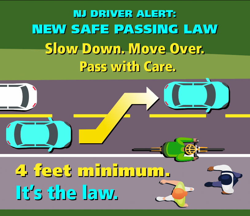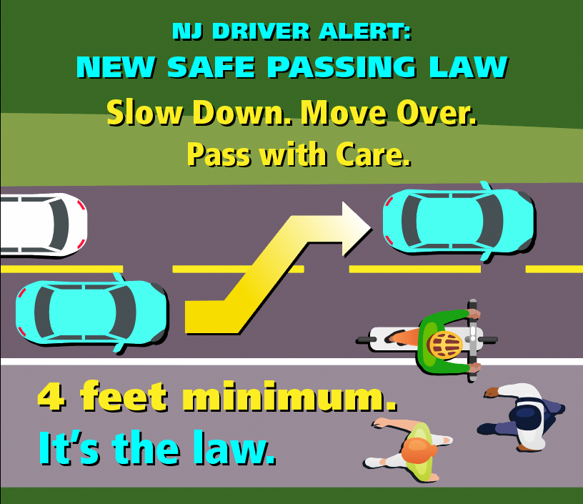 New Jersey’s new #SafePassingLaw requires motorists to move over 4 feet when safe, or slow down to 25 mph for pedestrians, bicyclists, wheelchair users and other vulnerable road users. #PassMeLikeYouKnowMe